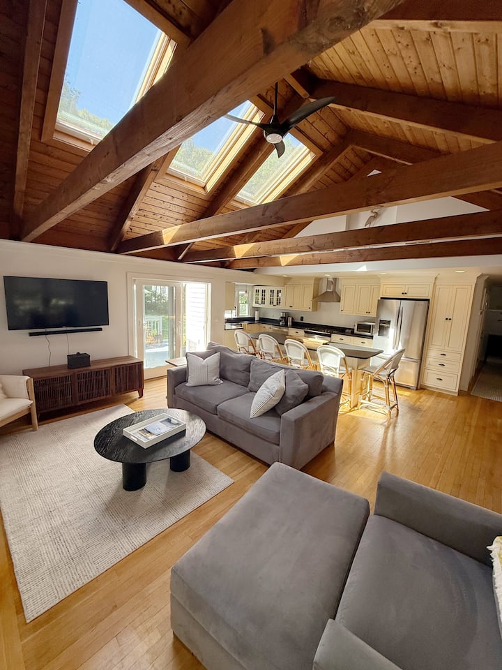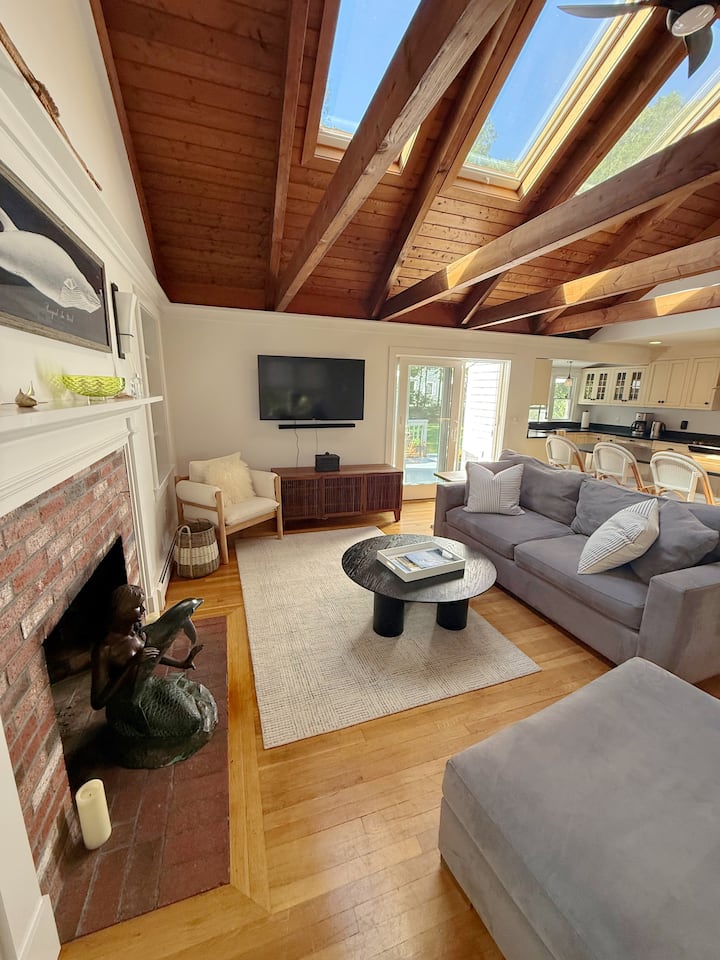 Ontsnap naar Sea Salt Cottage in Sandwich, MA – je typische Cape Cod-uitje. Deze lichte 3BR, 2BA-woning beschikt over gewelfde plafonds, een chef-kokskeuken en een afgewerkte kelder met surround sound voor gezellige filmavonden. Drink koffie op de veranda, omringd door bloeiende hortensia's, ontspan op het dek of verzamel je bij de vuurplaats. Minuten naar stranden, de promenade, het centrum, restaurants, Treehouse Brewery, Cape Cod Canal, wandelroutes en historische plekken. Gezinsvriendelijk en dicht bij alles.