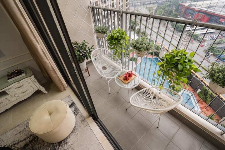 * BALKON met uitzicht op de straat, Thang Long boulevard en Pham Hung straat. Het uitzicht ligt dicht bij BigC-promotie.