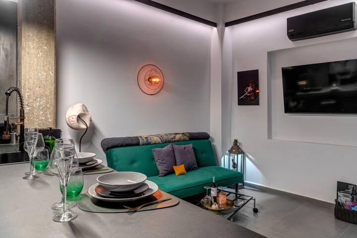 De loft is zeer gemakkelijk te voet te bereiken vanaf de veerboot. Het is gelegen in het hart van Hermoupoli, op slechts 50 meter van de jachthaven en alle recreatieve voorzieningen (cafés, bars, restaurants en traditionele tavernes). Het belangrijkste Miaouli-stadhuisplein en de taxistandplaats liggen op 200 meter afstand en het Apollon-theaterplein ligt op slechts 300 meter afstand. Je vindt twee supermarkten in de buurt - een direct achter het gebouw (50 m) en een andere aan de overkant van de steeg voor het gebouw (100 m).