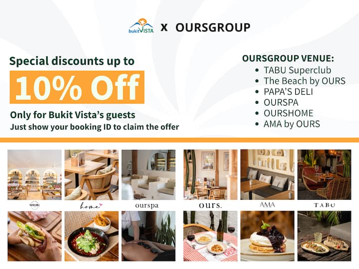Profiteer van maximaal 10% korting op al onze OURSGROUP-locaties, waaronder restaurants, spa's en lounges, exclusief voor gasten van Bukit Vista. Toon eenvoudig je boekings-ID op een OURSGROUP-locatie (zoals TABU Superclub, OURSPA of PAPA'S DELI) om je korting te claimen en te genieten van je favoriete Bali-spots met extra waarde.