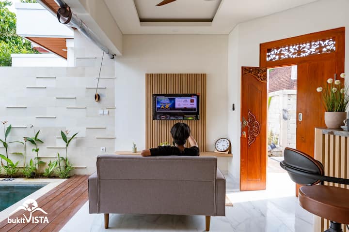 Deze moderne villa, beheerd door Bukit Vista, verscholen in de rustige omgeving van Uluwatu, belooft een soepel en comfortabel verblijf. De openluchtindeling is ontworpen met een mix van Balinese charme en eigentijdse elegantie en verbindt naadloos binnen- en buitenruimtes en dompelt je onder in de natuur.