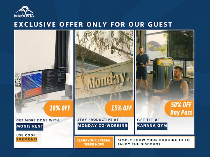 Verhoog je productiviteit op maandag Co-Working met 15% korting exclusief voor Bukit Vista-gasten. Laat je reserveringsnummer aan de balie zien en geniet van een stijlvolle, gerichte werkplek.