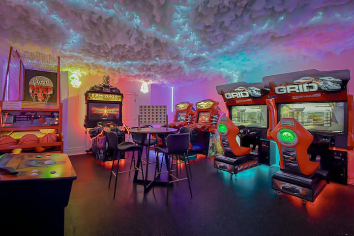 Privé-arcade – Basketbalwedstrijden, motor- en rijsimulators, Golden Tee 2025, PlayStation 5 en klassieke arcades. “Beter dan Dave & Buster's!”