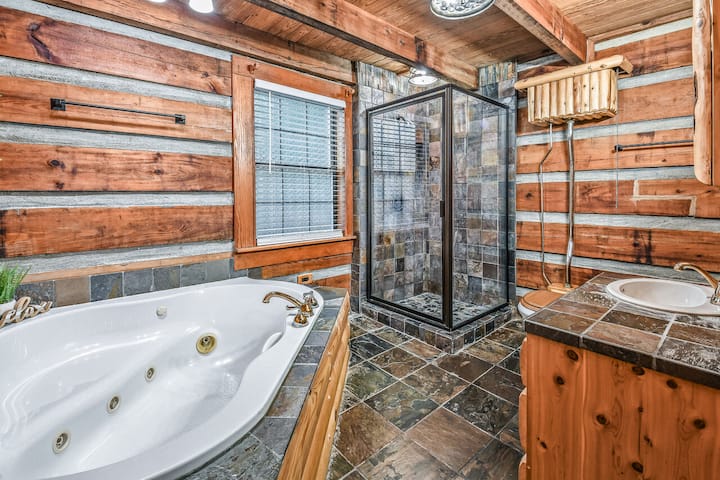Ontsnap naar de Smoky Mountains en ontdek de charme van deze gezellige, huisdiervriendelijke rustieke hut met 3 slaapkamers en 2 badkamers, gelegen op slechts 3 mijl van het spannende Soaky Mountain Waterpark en het Sevierville Convention Center. Dit toevluchtsoord op twee niveaus is ontworpen om comfortabel plaats te bieden aan maximaal acht gasten en ademt een warme en uitnodigende sfeer uit die net als thuis voelt. Ontspan na een dag vol avontuur in het bubbelbad, verzamel je rond de vuurplaats onder de sterren en haal je favoriete programma's bij met tv-streaming en wifi. Omarm de schoonheid van de natuur en creëer onvergetelijke herinneringen in dit perfecte thuis weg van huis - waar je harige vrienden ook welkom zijn!