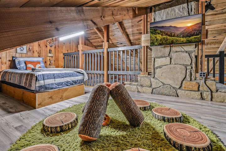 Ontsnap naar de Smoky Mountains en ontdek de charme van deze gezellige, huisdiervriendelijke rustieke hut met 3 slaapkamers en 2 badkamers, gelegen op slechts 3 mijl van het spannende Soaky Mountain Waterpark en het Sevierville Convention Center.