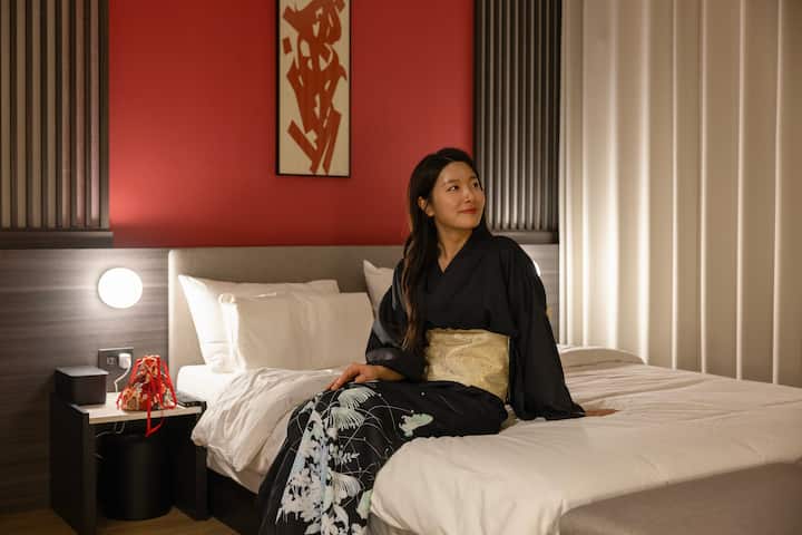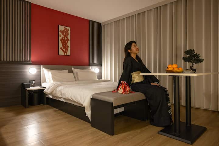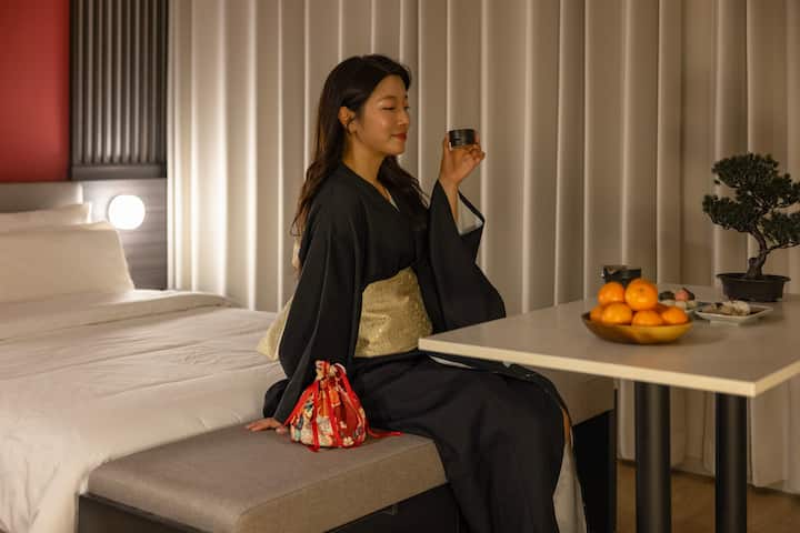 De Gorum Ryokan Hotel by Cozy Branch's Gorum Deluxe Room is uitgerust met een 65-inch smart-tv, styler, OTT, bidet, styler, queensize bed en luxe hotelbeddengoed.