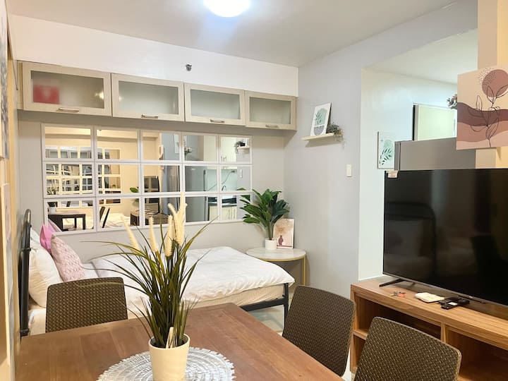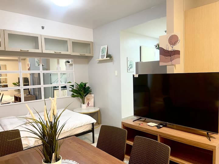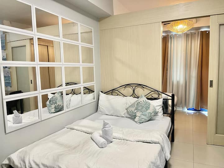 TOWER A Sea Residences, een stijlvol minimalistisch appartement met 4 bedden met uitzicht op MALL OF ASIA & ARENA. Kelder parkeerplaats te huur 800/nacht en vereiste reservering, betaling en kenteken voor registratie.