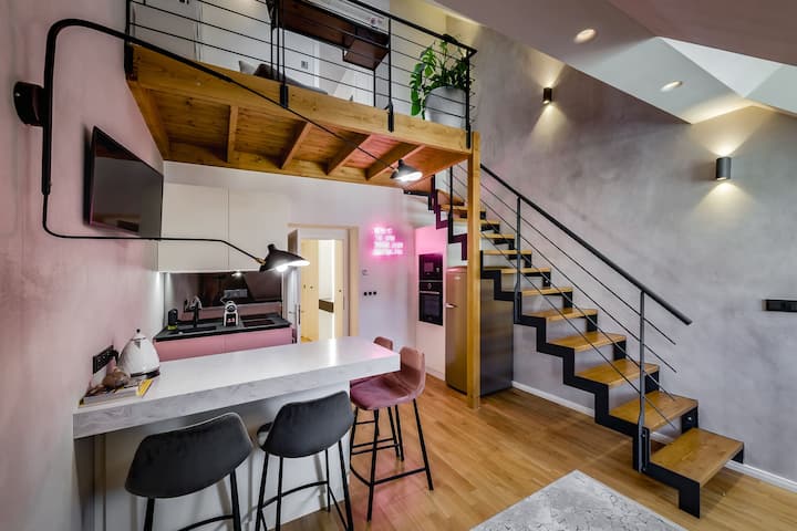 Ervaar het hoogtepunt van het stadsleven in deze luxe loft van 64 m ² met twee verdiepingen in de bruisende wijk van Praag. Op loopafstand liggen prachtige parken, het historische uitzichtpunt Petřín, de rivieroever en de pittoreske Lesser Town. Het appartement beschikt over een terras met prachtig uitzicht, overal airconditioning, een goed uitgeruste keuken en moderne meubels en apparaten, terwijl de indeling van de loft voor privacy en ruimte voor iedereen zorgt.