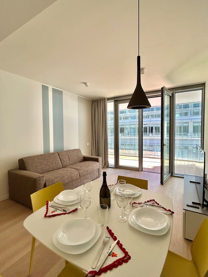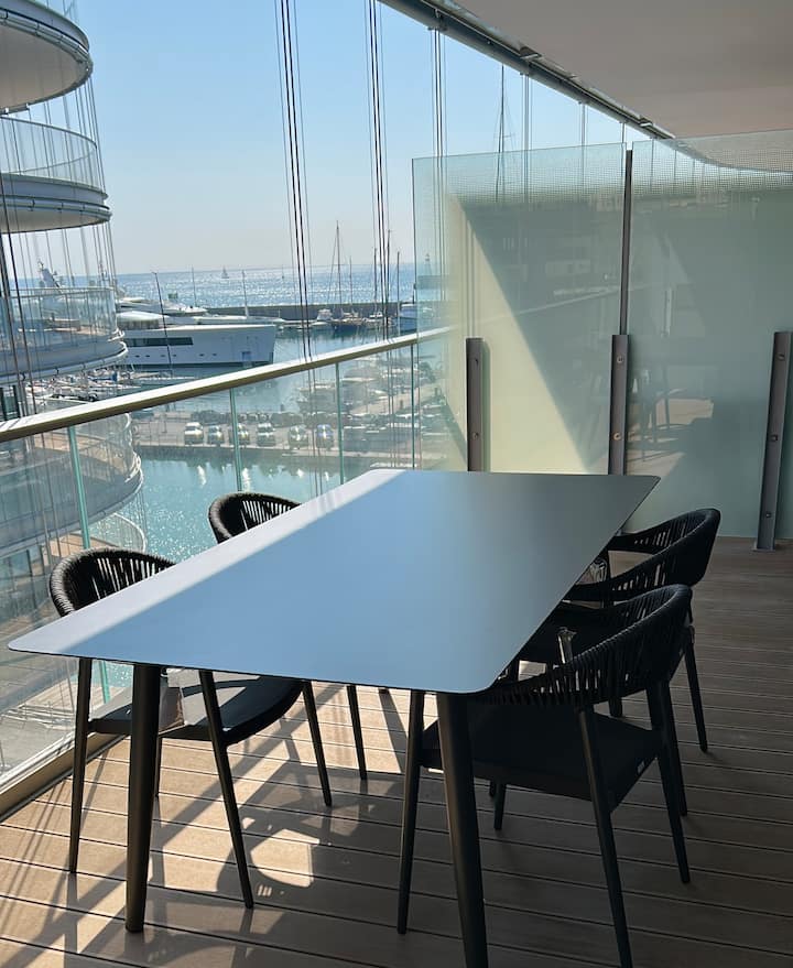 Verblijf in een elegant appartement met airconditioning gelegen in een exclusief prestigieus complex, ontworpen door de beroemde architect Renzo Piano, dat bestaat uit twee moderne gebouwen in de vorm van een romp, gekenmerkt door een lichte en transparante structuur met grote ramen die een prachtig uitzicht op de zee en de jachthaven bieden, waardoor de sfeer uniek en onvergetelijk is.