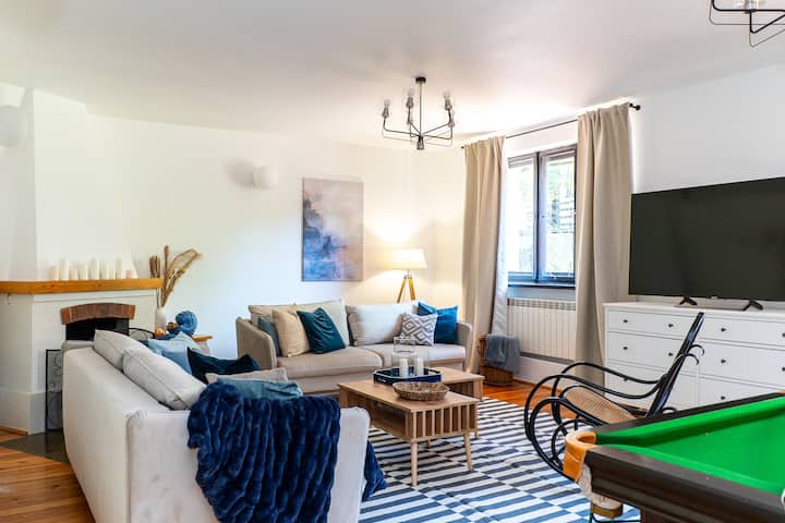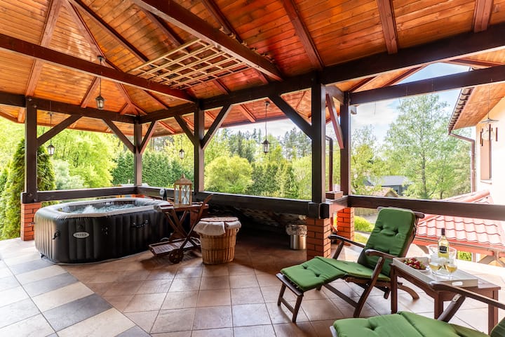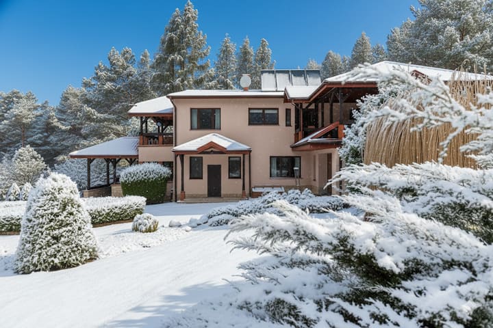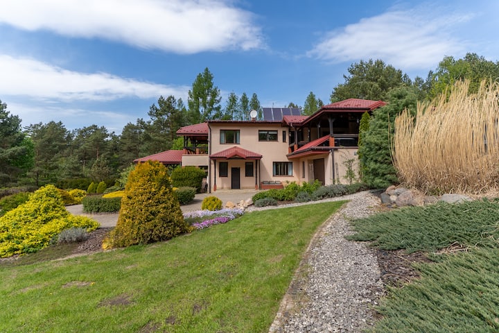 De Hamptons Villa is een ruim huis met een oppervlakte van meer dan 500 m², op 40 minuten van Warschau, ideaal voor ontspanning, integratie en workshops. Vijf slaapkamers, drie badkamers, een woonkamer met een open haard, biljart, een bioscoopzaal (alleen beschikbaar in het zomerseizoen). Drie terrassen, waaronder een met een jacuzzi en barbecue. Grote tuin met zwembad, sauna en ontspanningsruimte. Geschikt voor maximaal 21 personen. Een ruimte die bij jouw visie past, of je nu een uitje, workshop of bedrijfsbijeenkomst plant.