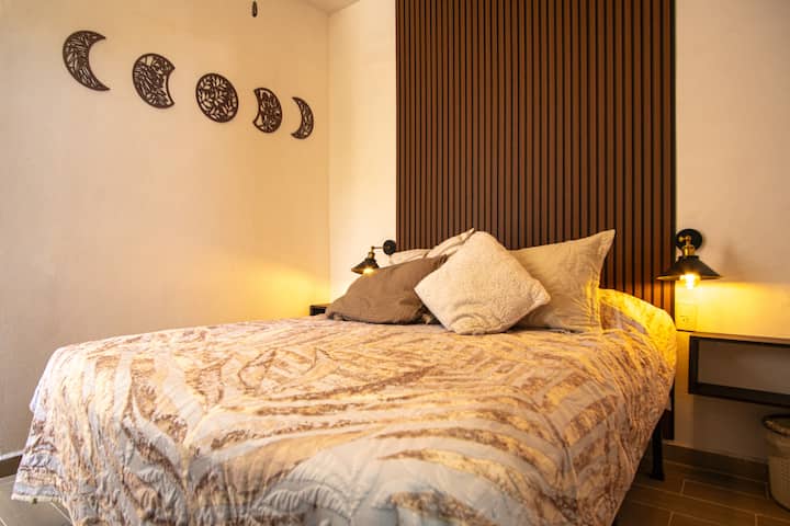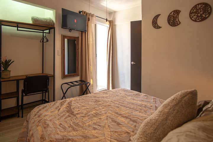 Je suite is uitgerust met alles wat nodig is voor een aangenaam en productief verblijf. Geniet van een queensize bed met zware gordijnen voor optimale rust, tv met Netflix, plafondventilator, bureau en exclusieve badkamer voor jou en je metgezel.