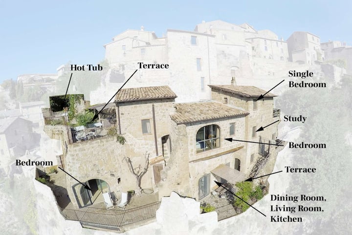 Dit unieke labyrintische huis op 3 verdiepingen bestaat uit verbouwde en gemoderniseerde middeleeuwse boerderijen en 3000 jaar oude Etruskische grotten, compleet met originele Etruskische columbaie aan de muren.