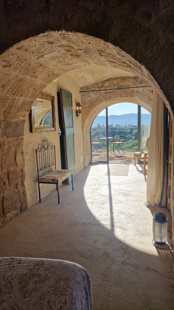 Vanuit de aansluitende gang kun je er ook voor kiezen om een andere trap te nemen die naar buiten leidt naar het terras van de suite. Dit grote terras omringt de suite, die direct is gebouwd in de tufsteen waarvoor het gebied beroemd is. De ruime suite biedt voldoende ruimte om te ontspannen en te slapen en heeft ook een eigen badkamer.