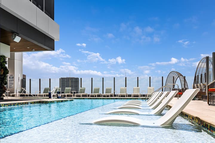 Geniet ter plaatse van het gemak van een restaurant binnen en een zwembad met een bar op het dak met uitzicht op de uitgestrektheid van de stad.