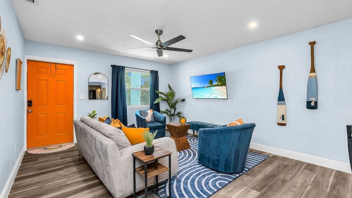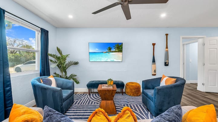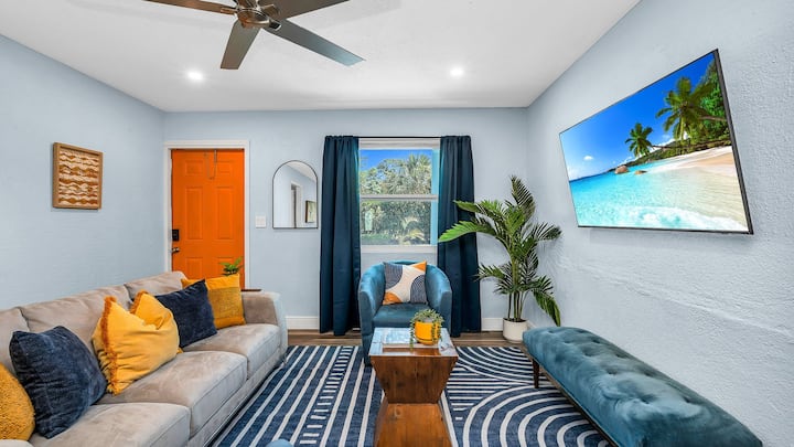 Modern 4BR, 2BA strandhuis op slechts een steenworp afstand van de Intracoastal en de Peanut Island-shuttle. Met een stijlvol interieur, snelle wifi en een moderne tuin met een buitenlounge, een tafel met gasvuur en lichtslingers - perfect om te ontspannen na een dagje zon. Dit West Palm Beach-retraite is ideaal voor gezinnen of groepen en combineert comfort, toplocatie en relaxte charme aan de kust met eindeloze mogelijkheden voor plezier op het water en onder de zon.
