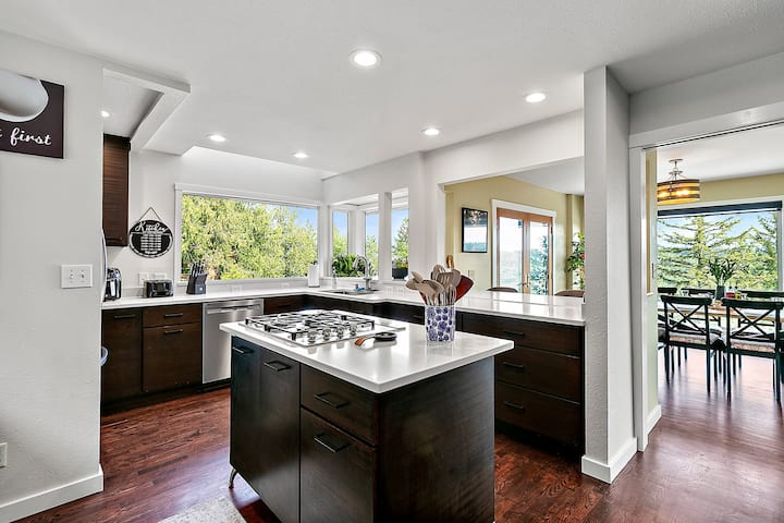Op slechts een steenworp afstand kun je je verzamelen rond de enorme eettafel voor 10 personen, met twee extra stoelen aan de aangrenzende bar op aanrechthoogte - perfect voor grote familiemaaltijden of groepsvieringen. Alles is omgeven door een prachtig panoramisch uitzicht op Mount Rainier en de uitgestrekte Green River Valley, waardoor elke hap een feest voor de ziel is. Of je nu kookt, dineert of gewoon van het uitzicht geniet, deze ruimte is ontworpen om mensen samen te brengen.