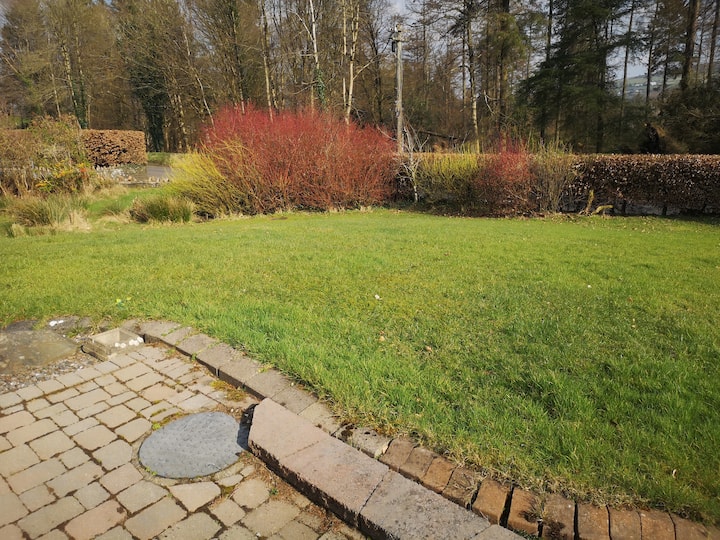 Deze charmante landelijke accommodatie ligt in een prachtig aangelegde tuin, omgeven door glooiende groene gazons, volwassen bomen en levendige bloembedden, en biedt de perfecte mix van rust en comfort.