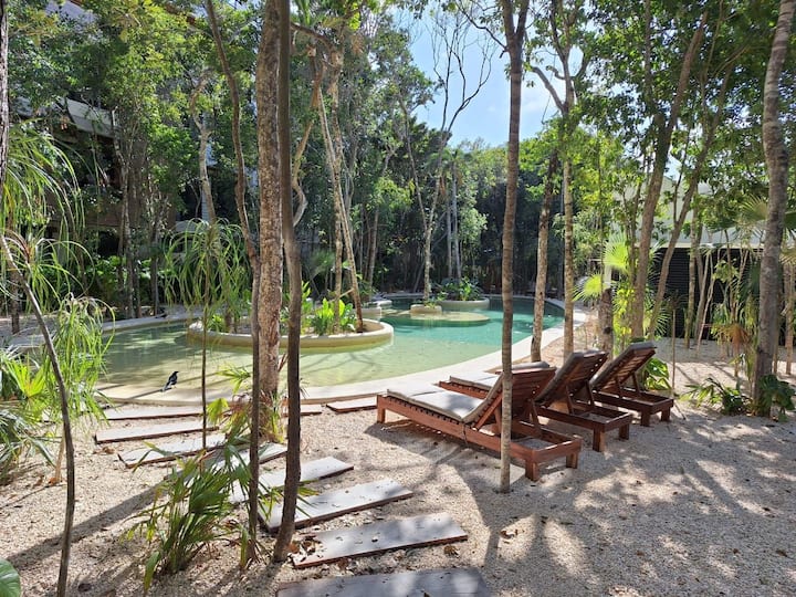 Het huis ligt op slechts een korte fietsafstand (4 minuten) van de ongerepte stranden van Tulum, op 10 minuten afstand van het bruisende stadscentrum van Tulum voor lokale winkels en eetgelegenheden en op slechts 15 minuten afstand van de iconische Maya-ruïnes.