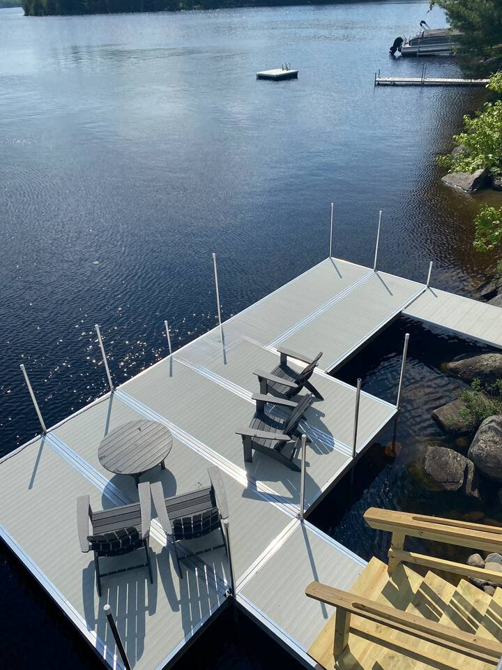 Een ander belangrijk kenmerk van het huis is het uitgestrekte dok op het lagere niveau, ontworpen om veel ruimte te bieden om te ontspannen en te genieten van het meer. Het is toegankelijk vanaf zowel de buitenkant van de woning als direct vanaf de veranda via een trap die naar het dok leidt. Het is uitgerust met klassieke Adirondack-stoelen, een tafel en voldoende ruimte voor meer.