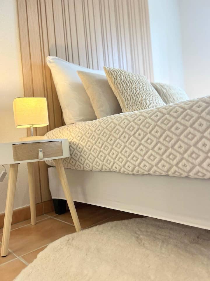 • Een stijlvolle, gastvrije slaapkamer met een comfortabel tweepersoonsbed, beddengoed en beddengoed van hoge kwaliteit