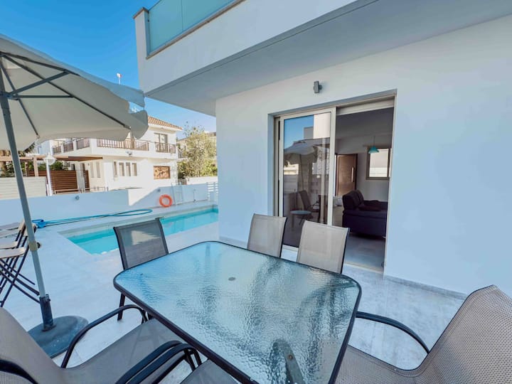 Een onlangs gerenoveerde villa met 3 slaapkamers, een eigen zwembad, een jacuzzi, uitzicht op zee en modern comfort. Het ligt in een rustige omgeving van Pernera, op slechts enkele minuten van het strand, restaurants en winkels, en is de perfecte uitvalsbasis voor een ontspannen vakantie op Cyprus.