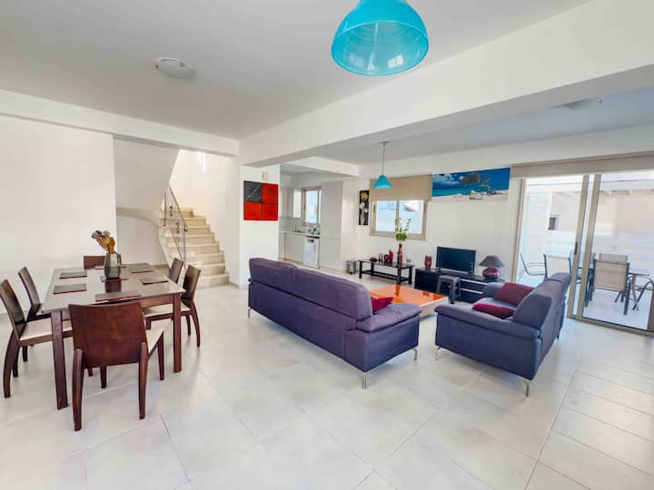 De villa ligt in de rustige wijk Pernera, vlakbij het strand en op slechts enkele minuten van een verscheidenheid aan restaurants, cafés en buurtwinkels. Protaras en de levendige boulevard zijn vlakbij en bieden meer eet-, winkel- en uitgaansmogelijkheden. Schilderachtige wandelingen langs de kust, gezinsvriendelijke stranden en wateractiviteiten liggen allemaal binnen handbereik.