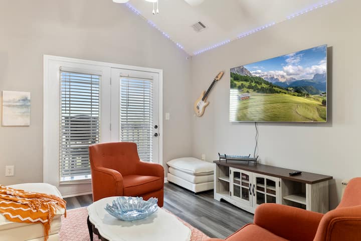 DE WOONKAMER: heeft een 75" tv met toegang voor gasten, zodat je gewoon kunt inloggen op je accounts en je favoriete programma kunt oppakken waar je gebleven was. (Er is geen kabel). Comfortabele bank en zithoek met koffie- en bijzettafels en veel verlichting bieden een geweldige verzamelruimte. In de console onder de tv vind je een uitleenbibliotheek ("neem er een, laat er een") en een aantal regenachtige dagspellen voor nat weer. Er zijn extra spreien en dekens voor die regenachtige of koude nachten tijdens het kijken naar een film of weekendspellen.