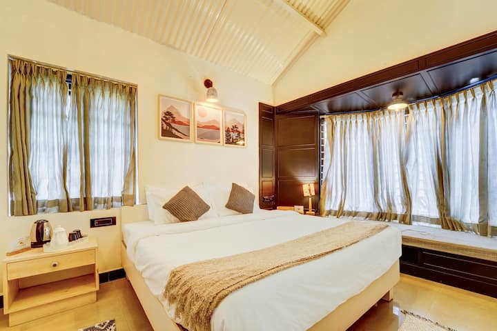 Deze 3-BHK-retraite ligt op 6 km van Doddabetta Peak en biedt een rustige ontsnapping in de heuvels. Villa beschikt over een weelderige buitentuin en een gezellige woonkamer met een 5-zitsbank, warme verlichting en charmante koloniale artefacten. De prachtige veranda heeft voldoende zitplaatsen, grote ramen en een prachtig uitzicht. Er is ook een gezellig hoekje met een kast en ramen, perfect voor rustige momenten. Een enorm balkon biedt een adembenemend panoramisch uitzicht, waardoor het een ideale plek is om te ontspannen en te genieten van de frisse berglucht.