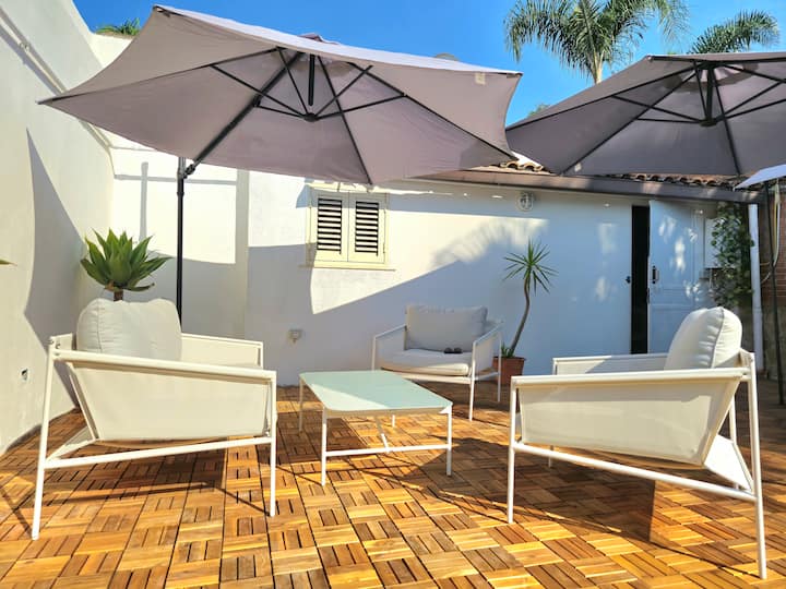 De hoofdslaapkamer is ruim en smaakvol ingericht, met een queensize bed, een plafondventilator en openslaande deuren met horren naar het terras. Het is een oase van ontspanning en intimiteit, perfect voor stellen of gasten die op zoek zijn naar een rustig en comfortabel toevluchtsoord.De moderne inrichting zorgt voor een warme en uitnodigende sfeer. Je kunt uitrusten na een dag vol activiteiten, een boek lezen of gewoon genieten van de wind in de speciale woonkamer op het terras.