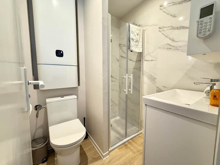- Een moderne badkamer met douche, wastafel en toilet.