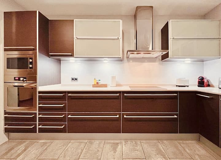 De keuken is volledig gevuld en heeft alles wat je nodig hebt voor ontbijt, koken of een goede koffie drinken. Voor uw comfort en comfort heeft de keuken een capsule koffiezetapparaat (Nespresso), vaatwasser, magnetron, oven, waterkoker… En voor het geval je dat nodig hebt, heb je ook een wasmachine tot je beschikking.