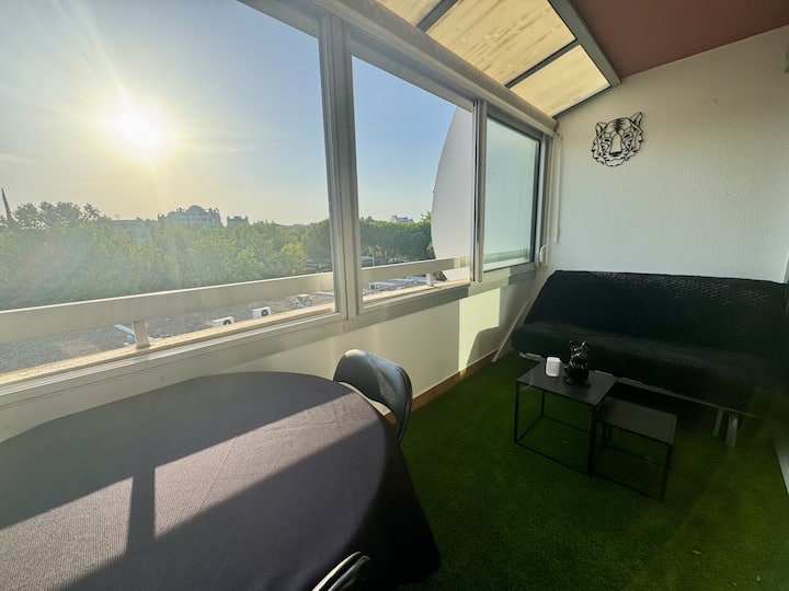 Lichte studio met loggia, zwembad en parkeerplaats – La Grande-Motte Deze moderne studio van 33 m² is geschikt voor maximaal 3 personen (met een extra bed) en is gelegen in een rustige residentie met een gedeeld zwembad en privéparkeerplaats. Perfect voor koppels of kleine gezinnen die willen genieten van een zonnig verblijf in La Grande-Motte. De accommodatie is inclusief: Comfortabele slaapruimte Volledig uitgeruste open keuken: koelkast, oven, magnetron, koffiezetapparaat, borden Gemeubileerd balkon met open uitzicht