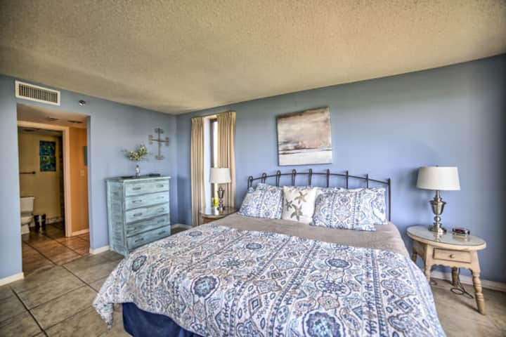 Dit appartement met 2 slaapkamers en 2 badkamers ligt in Beachside Tower One. Het is gelegen op de 3e verdieping van het gebouw aan de oostkant. Het heeft een grote slaapkamer aan de golfkant van het appartement met uitzicht vanaf het bed op het smaragdgroene water en suikerwitte zand. Er is een nieuw gerenoveerde eigen masterbadkamer met een extra grote bad/douche-combinatie. In de woonkamer, ook met uitzicht op de Golf van Mexico, staat een slaapbank, flatscreen-tv en veel zitplaatsen. De kamer heeft een stapelbed met een eenpersoonsbed bovenop en een tweepersoonsbed onderaan. Er is ook een extra eenpersoonsbed in de gastenkamer. De badkamer in de gang is ook gerenoveerd en heeft voor het gemak ook een deur naar de slaapkamer van de gasten. In de gang staat een stapelbare wasmachine/droger. De keuken is volledig uitgerust en de eet- en barruimte hebben genoeg stoelen en krukken om comfortabel te eten in het appartement. Het zwembad is groot en gunstig gelegen ten opzichte van het appartement. Buitengrillen, zonnebaden en eetruimtes samen met een fitnessruimte maken de gemeenschappelijke ruimtes gewoon perfect.