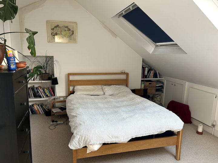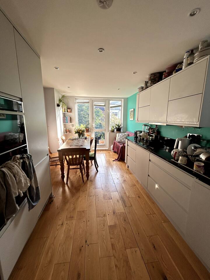 Twee tweepersoonsbedden in een woning in Noord-Londen