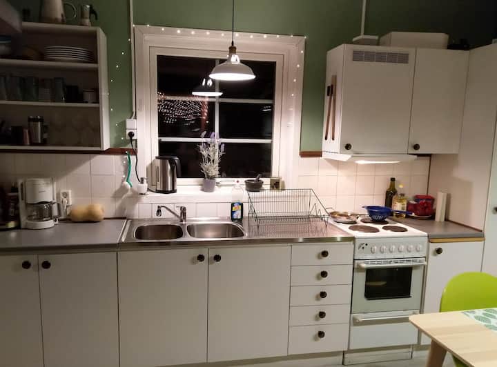 Het interieur van het huis straalt warmte en gezelligheid uit. Het typisch Scandinavische behang en de subtiele decoraties geven de kamer een uitnodigende sfeer. De open keuken is eenvoudig en functioneel, maar uitgerust met alles wat je nodig hebt voor gezellige diners. Een eettafel waar familie en vrienden kunnen samenkomen, maakt de sfeer compleet. Het huis heeft een steenoven die perfect is voor het bakken van brood of pizza.