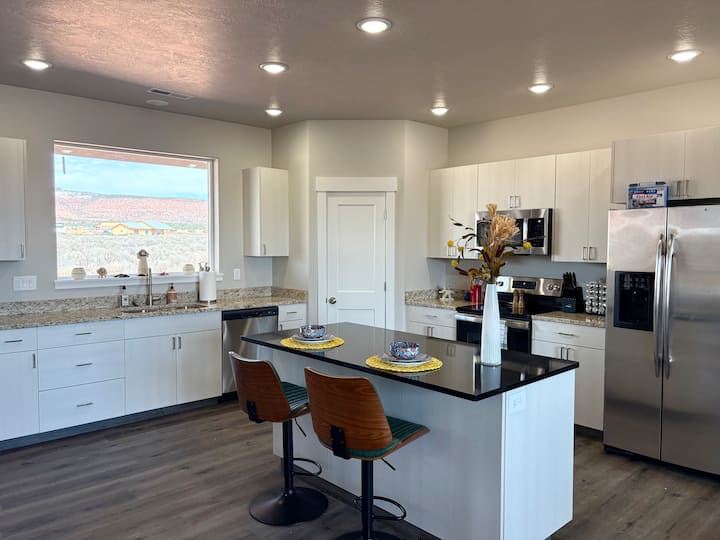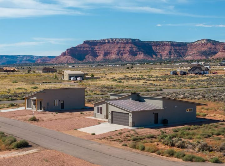 Twee gedurfde ontsnappingen op één terrein met een episch uitzicht. Je verblijf omvat zowel het Milky Way Manor als het Milky Way Hideaway. Het landhuis heeft 4 slaapkamers, 3 badkamers; de Hideaway voegt 2 slaapkamers, 2 badkamers, plus een gecombineerde garage voor 3 auto's toe. Alles is gloednieuw - huizen, beddengoed, meubels, keukengerei. Stap naar buiten naar de ongerepte donkere hemel van Utah, op slechts 13 km van Kanab. Perfect voor grote groepen, met wijd open ontwerpen, buitenruimte en sterrenkijkersnachten die je nooit zult vergeten.