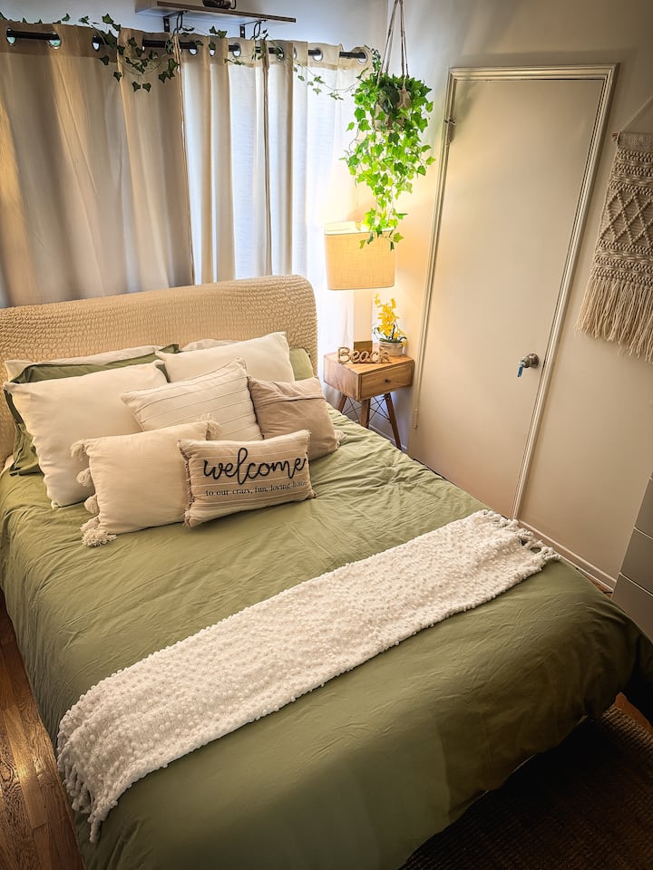 - Slaapkamer/woonkamer: queensize bed, twee nachtkastjes, comfortabele bank, Roku TV en eet-/werktafel.