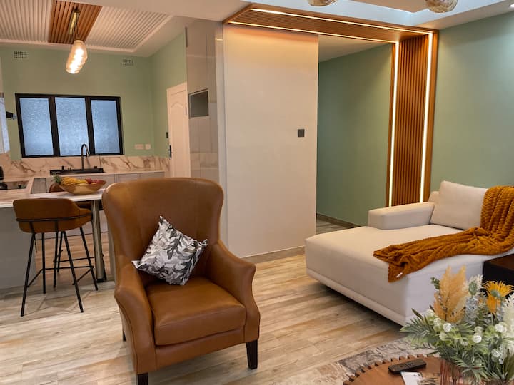 Welkom bij Muyeni BnB, een stijlvolle, comfortabele en duurzame accommodatie met moderne voorzieningen. Het beschikt over een luxe badkamer met een bad en wasserette, een slaapkamer met een queensize bed en werkruimte, en een volledig uitgeruste keuken met slimme apparaten. De gezellige lounge heeft een smart tv en snelle wifi. Aangedreven door een 8KVA zonnesysteem, is het ideaal voor reizigers die op zoek zijn naar comfort en milieuvriendelijkheid.