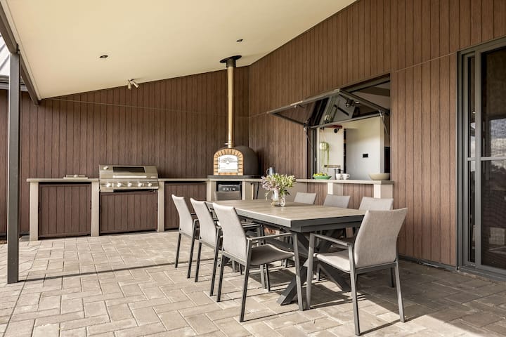 De uitgestrekte buitenalfresco biedt een prachtig uitzicht vanuit alle hoeken. Biedt een grote eethoek in de buitenlucht en ingebouwde gasbarbecue, een fantastische pizzaoven met houtvuur en een vuurplaats in de buitenlucht (alleen beschikbaar voor gasten buiten het brandverbodseizoen als je eerdere ervaring hebt en met vertrouwen werkt. Gast moet eigen hout leveren).