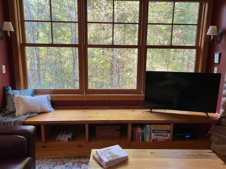 Zonnekamer: gezellige 3 seizoenen veranda met rieten meubels, elektrische open haard die ook de ruimte verwarmt, en vinyl-paneel ramen met schermen die volledige uitzicht op dik beboste achtertuin mogelijk maken.