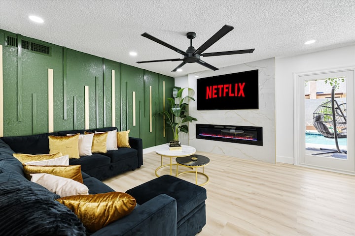 Dit Insta-waardige Vegas-verblijf brengt boetiekvibes en gedurfd design — met een eigen bioscoop, verwarmd zwembad + spa, vuurplaats en IG-ready groene muren. Slaap met 15 in zachte bedden, stream vanuit elke kamer en blijf verbonden met razendsnelle wifi van 1024 Mbps. Volledig gerenoveerd, huisdiervriendelijk en perfect voor groepen, families en makers van content. Glam ontmoet comfort — op slechts enkele minuten van de Strip. 🎬♨️📸