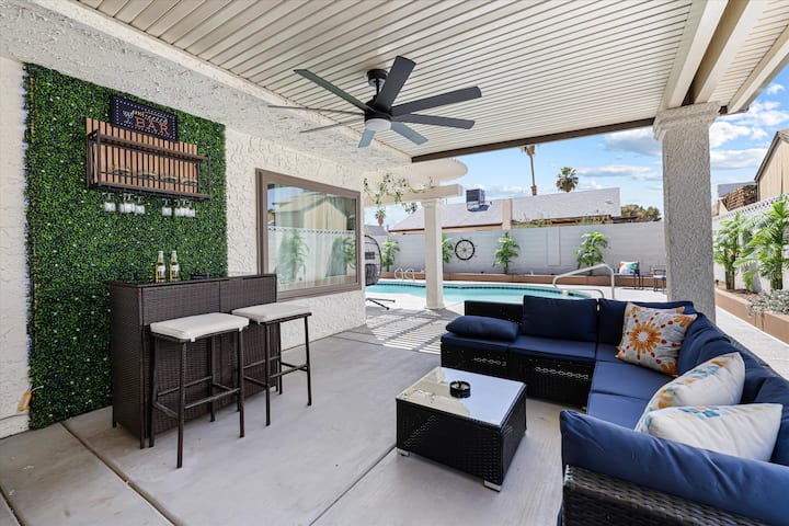 Stap in je eigen privéresort in Vegas — een volledig gerenoveerde woning ontworpen voor saamhorigheid, plezier en eindeloze foto's. Van de smaragdgroene keuken tot de weelderige achtertuin met vuurplaats en hangende eierstoelen, elk detail werd samengesteld voor onvergetelijke herinneringen.