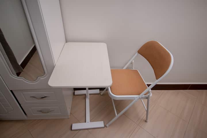 Je slaapkamer is zo ingericht dat je lekker kunt slapen. Je slaapt op een hoogwaardig matras dat 25 cm dik is en wordt geleverd met zachte katoenen lakens, vier zachte kussens en een verwarmd dekbed voor extra comfort. Een nachtkastje houdt de dingen die je nodig hebt bij de hand en een kledingkast geeft je veel ruimte om spullen op te bergen. Je hebt ook een aparte werkruimte, waardoor het gemakkelijk is om productief te blijven wanneer dat nodig is.
