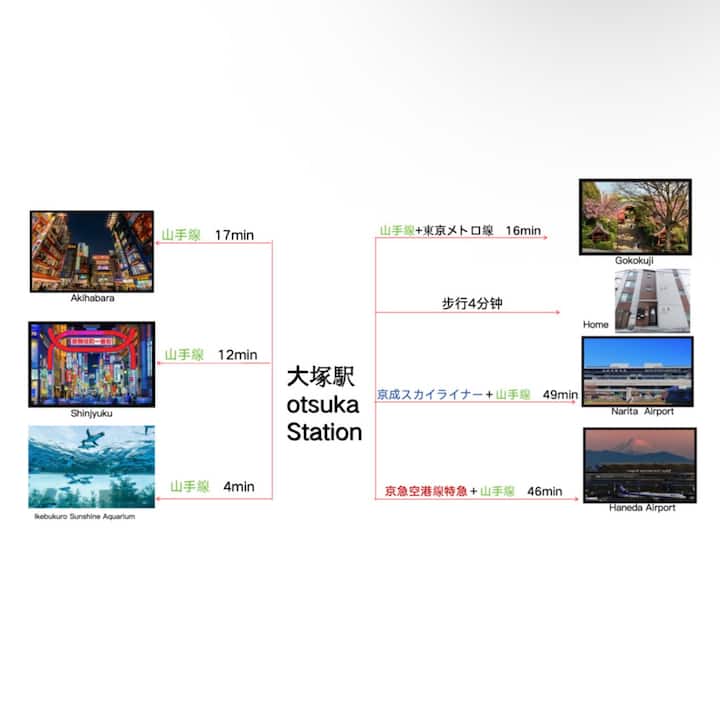 De accommodatie ligt op ongeveer 6 minuten lopen van station Otsuka (JR Yamanote-lijn) en op 4 minuten lopen van station Shin-Otsuka (Tokyo Metro Marunouchi-lijn). Dankzij de toegang tot twee treinlijnen kun je gemakkelijk populaire gebieden in Tokio bereiken, zoals Ikebukuro, Ueno, Akihabara en Hamamatsucho.