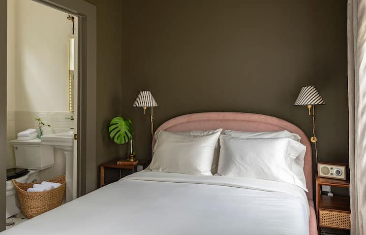Een zonnige suite met uitzicht op de binnenplaats, toegankelijk via de binnenplaats. Deze kamer is voorzien van een queensize bed, een eigen badkamer met douches, 100% katoenen beddengoed, een geluidsmachine, een Nespresso-apparaat en een espressomachine, een 42-inch flatscreen-tv, een bluetooth-radio, verduisteringsgordijnen en botanische toiletartikelen.