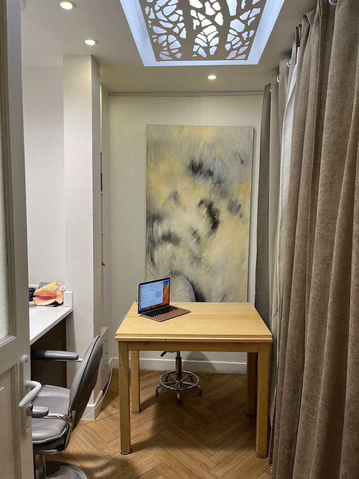 Welkom in mijn Loft kun je genieten in de badkamer, op de begane grond van een fauteuil, speciaal ontworpen voor kappers, een massagetafel, ik voel me daar zo goed dat ik er 4 jaar woon en reis om mijn klanten uit te breiden,