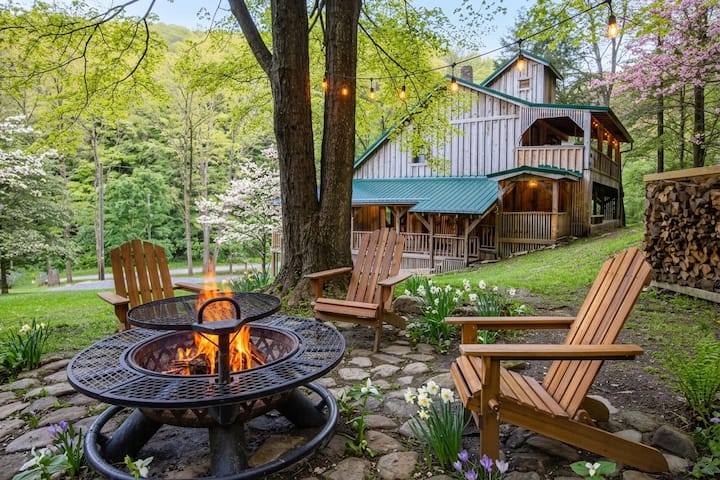 De veranda rondom kijkt uit op de beek, een stoel op de eerste rij voor rust en stilte. Laat de kinderen vuurvliegjes achtervolgen terwijl je ontspant bij de vuurplaats of geniet van het diner van de grill.