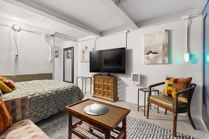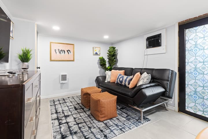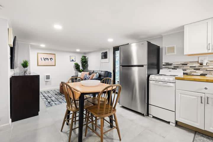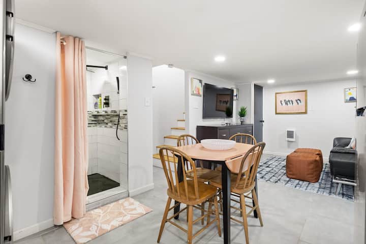 Het appartement is gelegen in het hart van West Hillsborough, op slechts enkele minuten van het charmante centrum. Of je nu wilt wandelen op de berg die op slechts 5 minuten rijden ligt of winkelen in de lokale winkels in het centrum, dan is dit de plek voor jou. We zijn goed gelegen in de driehoek, op slechts 20 minuten rijden van Durham en Chapel Hill en op 40 minuten rijden van Raleigh en Greensboro. Deze accommodatie is uitgerust met een volledig uitgeruste keuken en een wasmachine en droger. Er is een eethoek en twee woonkamers. De eerste woonkamer is boven, aangrenzend aan de grote woonkamer en de tweede is in de primaire suite beneden in de schuilkelder. Beide woonruimtes hebben een tv. Er zijn twee badkamers. Het volledige bad is boven en heeft een inloopdouche en het halve bad is in de schuilkelder net buiten de slaapkamer. Deze accommodatie is geschikt voor vier personen. Er is een bed voor 2 personen beneden en de zwarte bank in de woonkamer boven kan ook worden uitgeklapt tot een bed voor 2 personen.