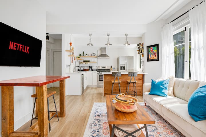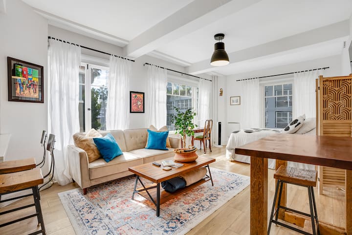 Welkom in je schuilplaats in een van de iconische Art Deco-gebouwen van Long Beach, op steenworp afstand van het congrescentrum en de winkels en restaurants in het centrum. Deze studio van 44 vierkante meter combineert vintage karakter met modern comfort. De ramen van de studio vullen de ruimte met zonneschijn en creëren een sfeer die zowel kalmerend als helder is. Van de volledige keuken van de chef-kok tot het eclectische decor dat we tijdens onze reizen hebben verzameld, hebben we de ruimte samengesteld met reizigers in gedachten, waardoor een gezellig, onderscheidend toevluchtsoord is ontstaan.