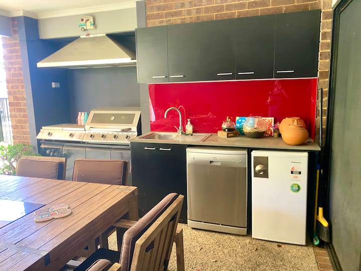Buitenkeuken met barbecue, wastafel en bank